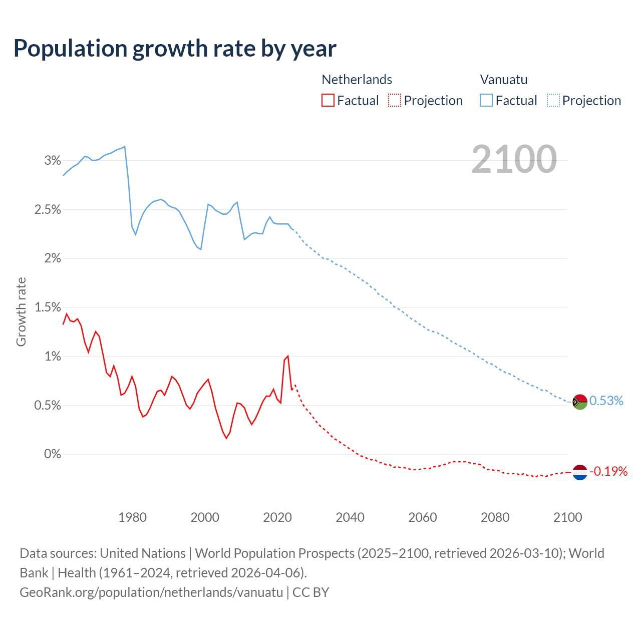 - For the last 10 years, the Netherlands has had an average growth rate of +0.62% per year vs +2.33% in Vanuatu.