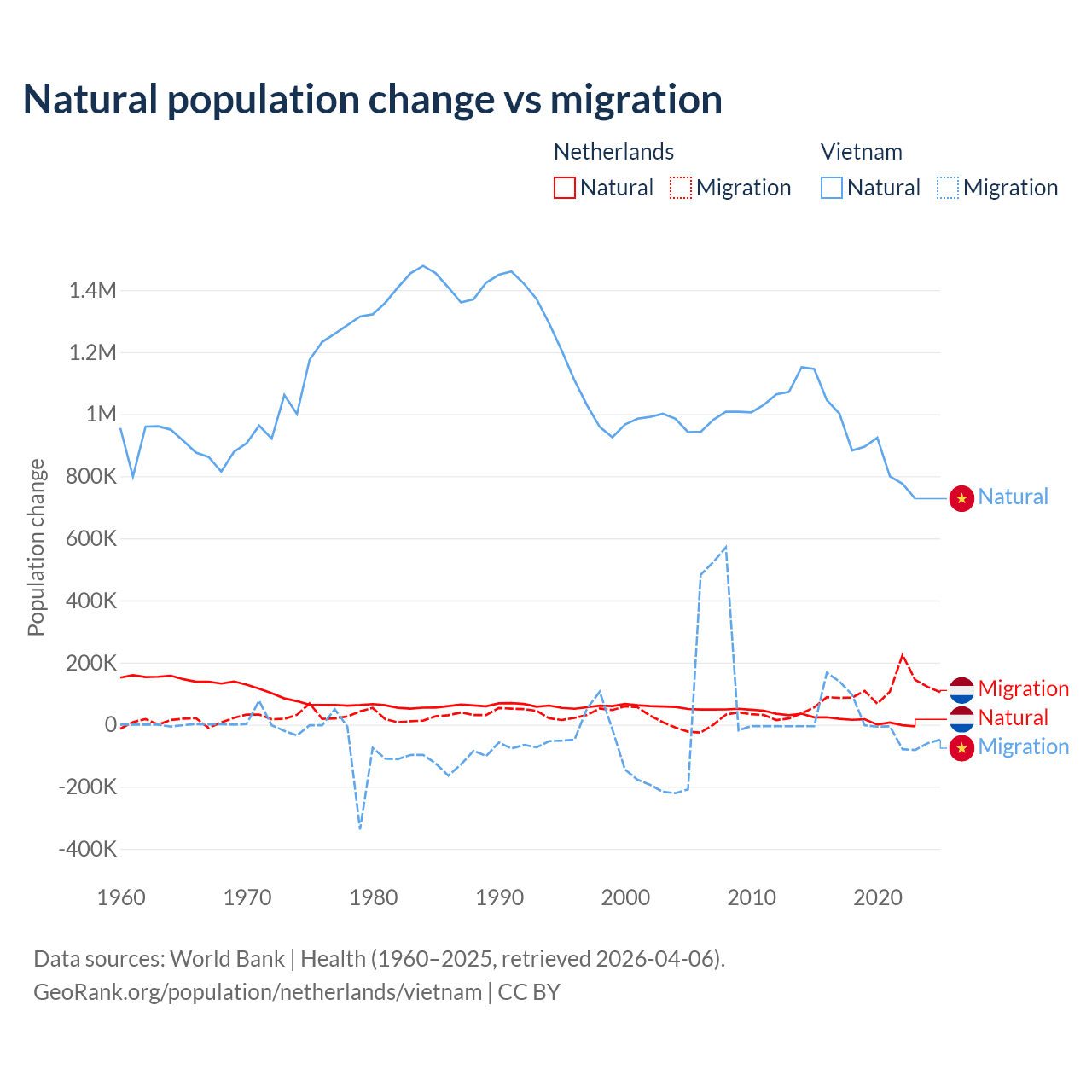 Over the last 10 years, 11.8% of the population change in the Netherlands is from natural causes (a gain of 134,554 people) and 88.2% is from migration (a gain of 1,006,495 people). In Vietnam 97.7% is from natural causes (a gain of 9,349,756 people) and 2.29% is from migration (a gain of 219,073 people).