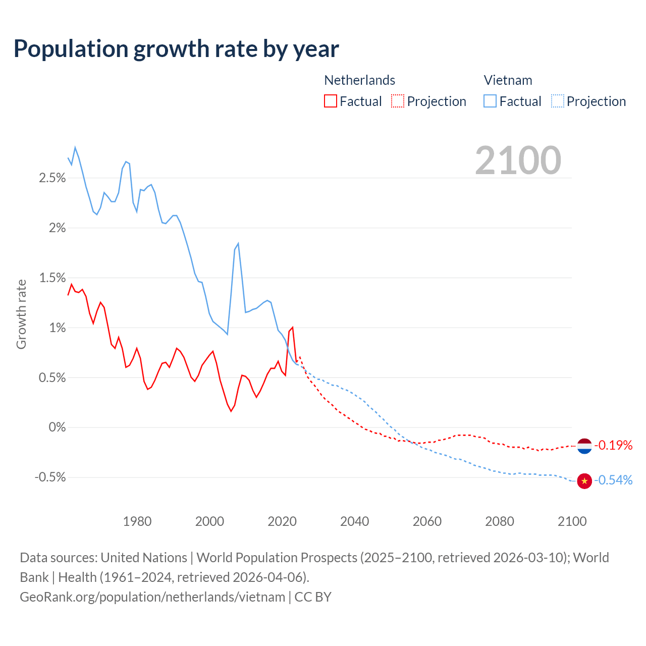 - For the last 10 years, the Netherlands has had an average growth rate of +0.62% per year vs +0.99% in Vietnam.