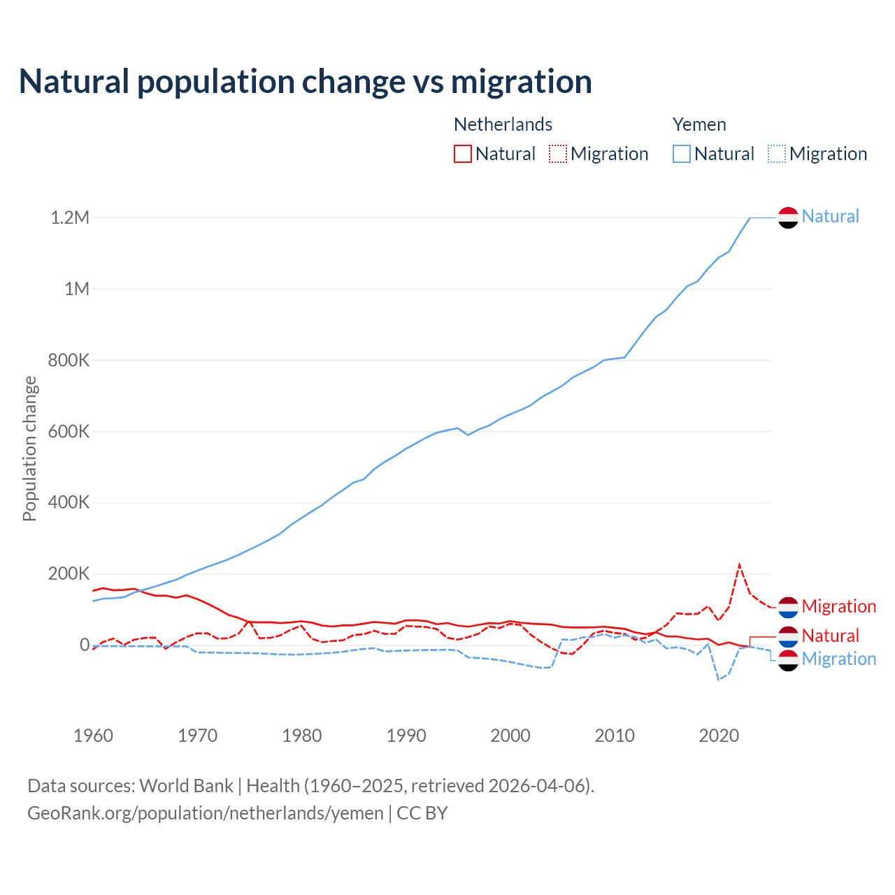 Over the last 10 years, 11.8% of the population change in the Netherlands is from natural causes (a gain of 134,554 people) and 88.2% is from migration (a gain of 1,006,495 people). In Yemen 97.8% is from natural causes (a gain of 10,460,813 people) and 2.17% is from migration (a loss of 231,814 people).