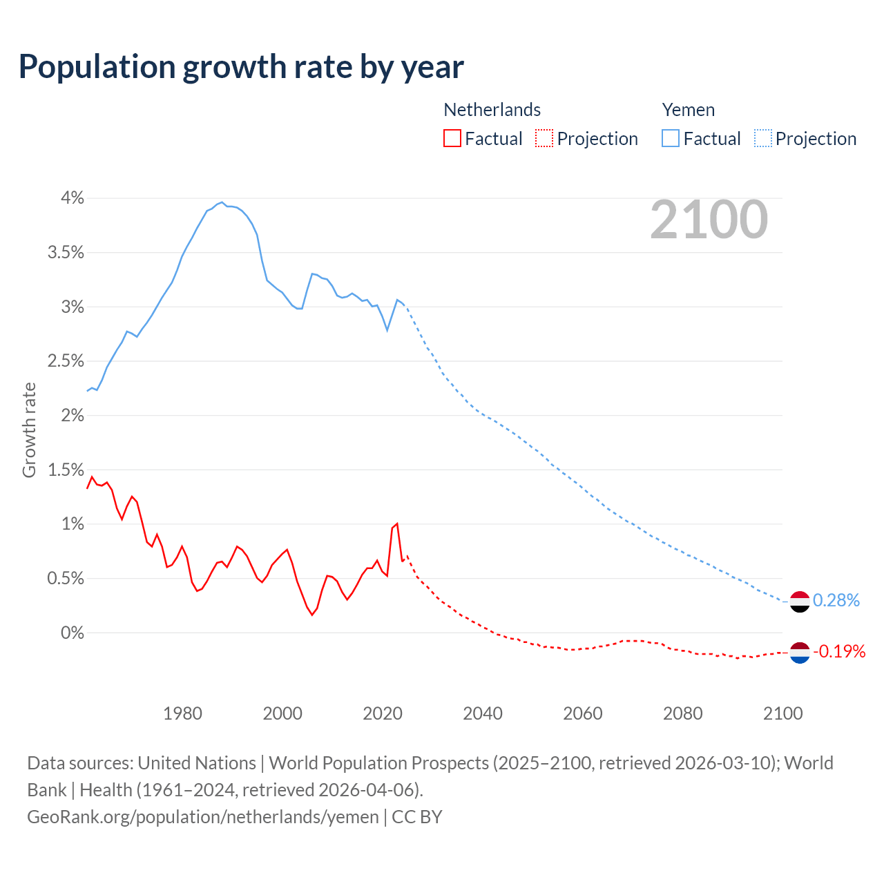 - For the last 10 years, the Netherlands has had an average growth rate of +0.62% per year vs +3% in Yemen.