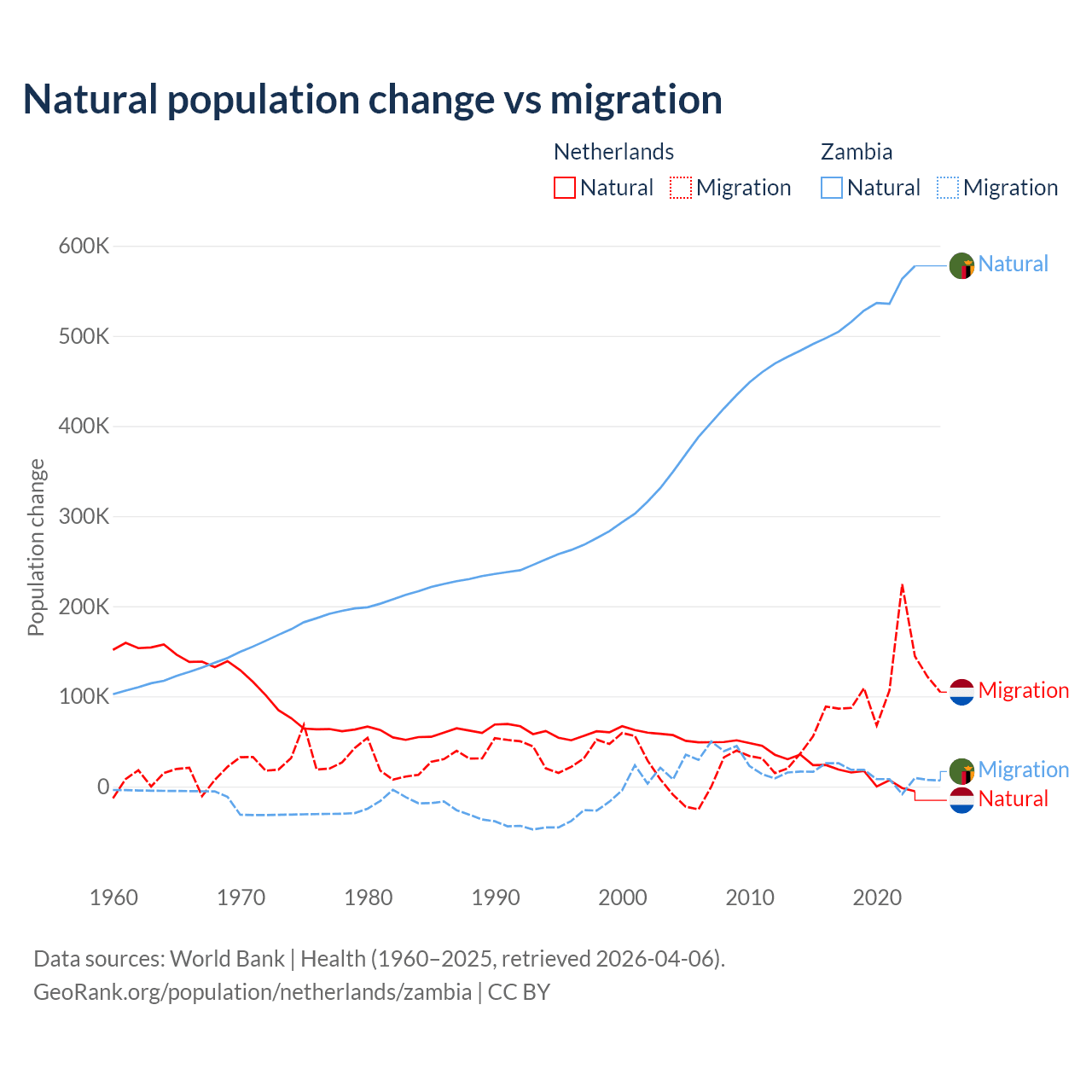 Over the last 10 years, 11.8% of the population change in the Netherlands is from natural causes (a gain of 134,554 people) and 88.2% is from migration (a gain of 1,006,495 people). In Zambia 97.4% is from natural causes (a gain of 5,233,797 people) and 2.58% is from migration (a gain of 138,554 people).