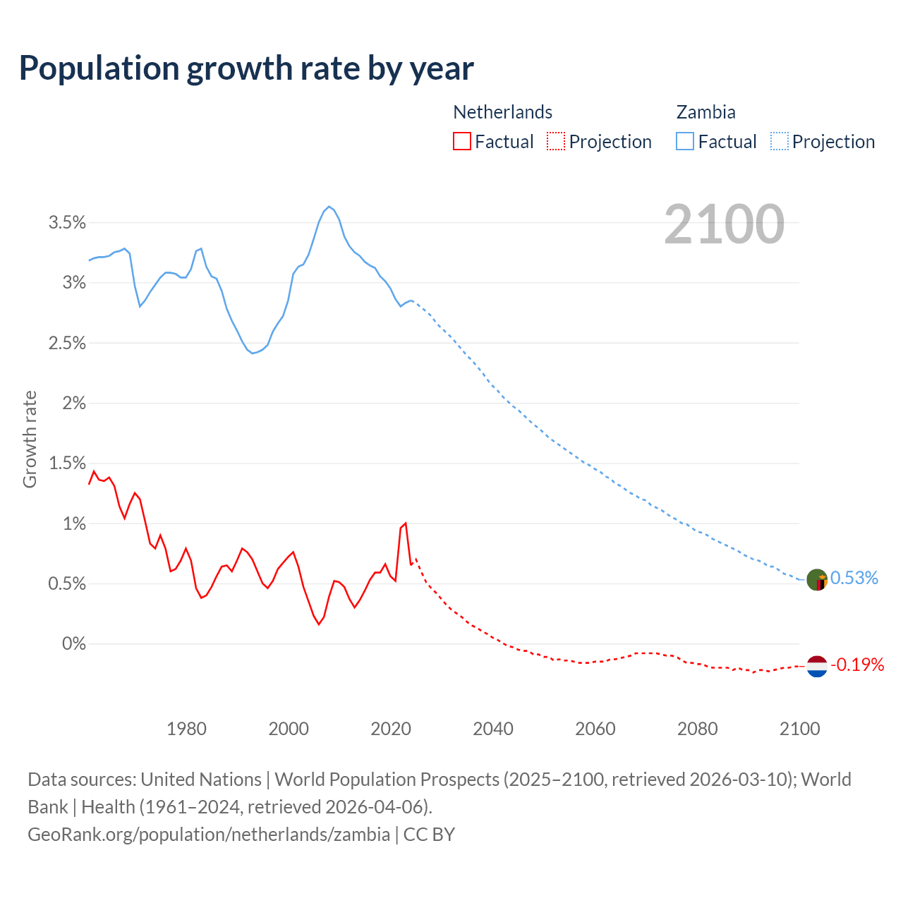 - For the last 10 years, the Netherlands has had an average growth rate of +0.62% per year vs +3% in Zambia.