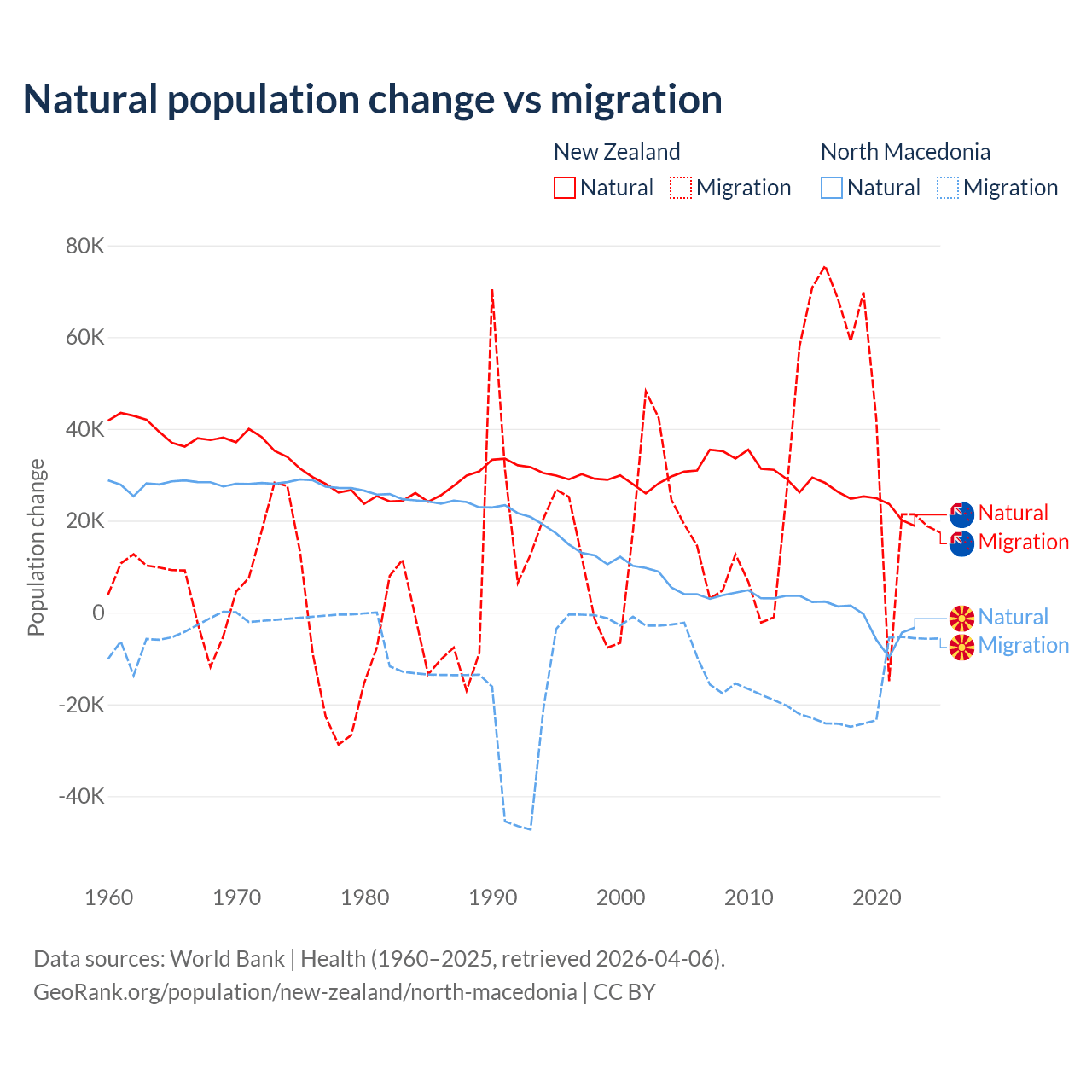 Over the last 10 years, 34.4% of the population change in New Zealand is from natural causes (a gain of 247,767 people) and 65.6% is from migration (a gain of 471,602 people). In North Macedonia 6.45% is from natural causes (a loss of 12,585 people) and 93.5% is from migration (a loss of 182,429 people).