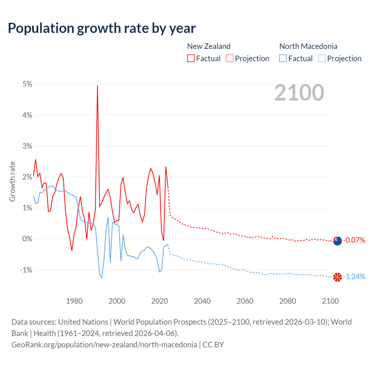 - For the last 10 years, New Zealand has had an average growth rate of +1.6% per year vs -0.48% in North Macedonia.