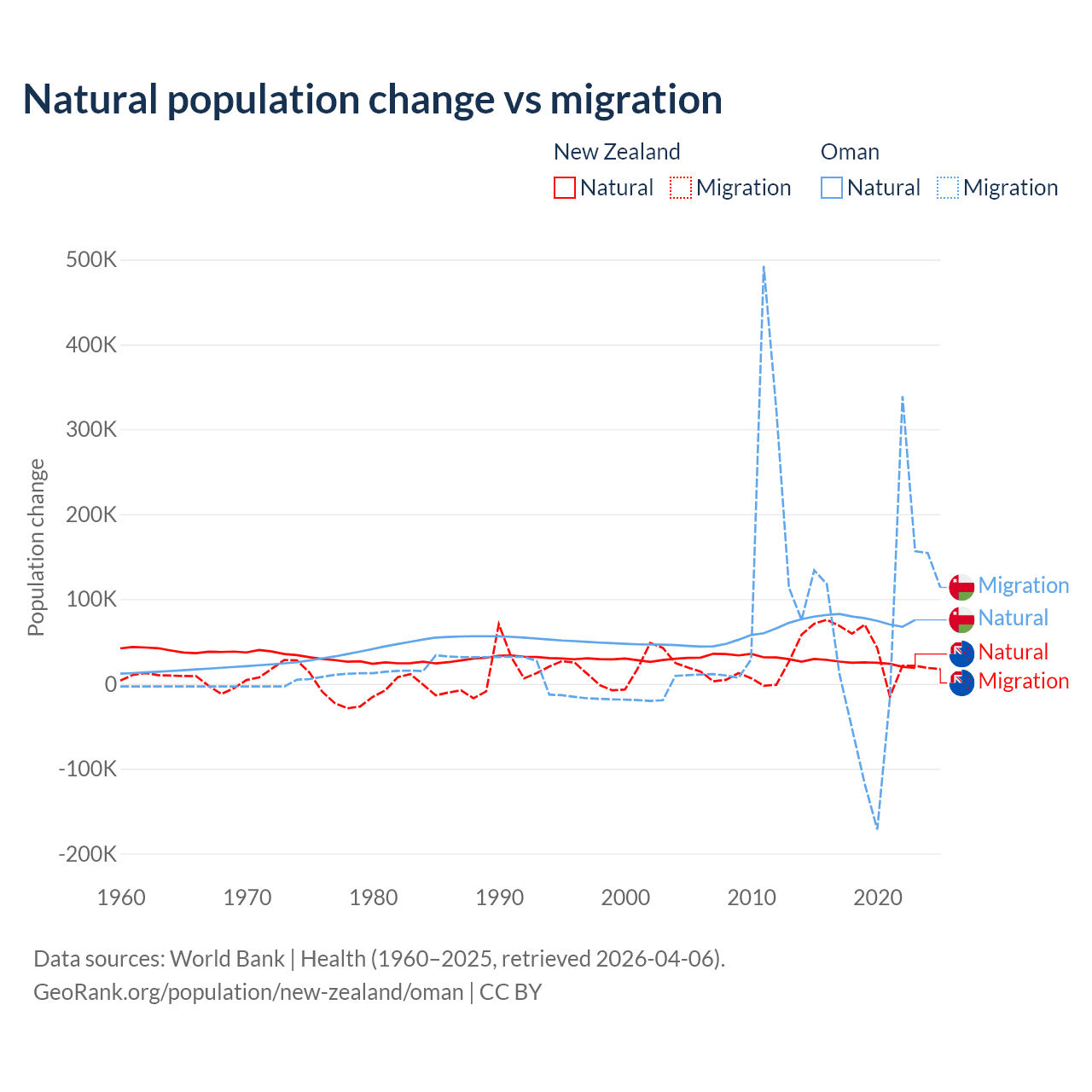 Over the last 10 years, 34.4% of the population change in New Zealand is from natural causes (a gain of 247,767 people) and 65.6% is from migration (a gain of 471,602 people). In Oman 61.6% is from natural causes (a gain of 763,049 people) and 38.4% is from migration (a gain of 475,565 people).