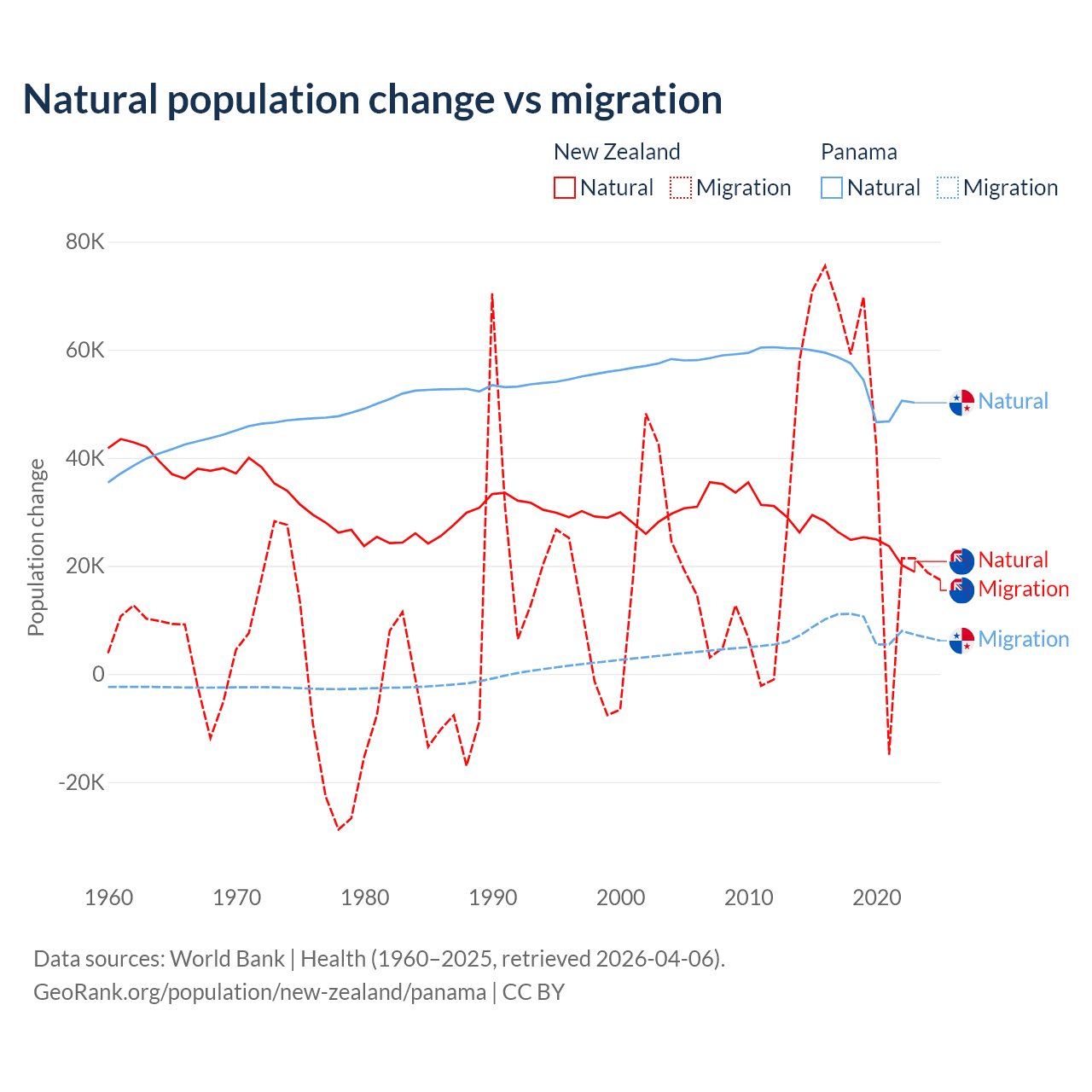 Over the last 10 years, 34.4% of the population change in New Zealand is from natural causes (a gain of 247,767 people) and 65.6% is from migration (a gain of 471,602 people). In Panama 86.5% is from natural causes (a gain of 544,211 people) and 13.5% is from migration (a gain of 84,849 people).