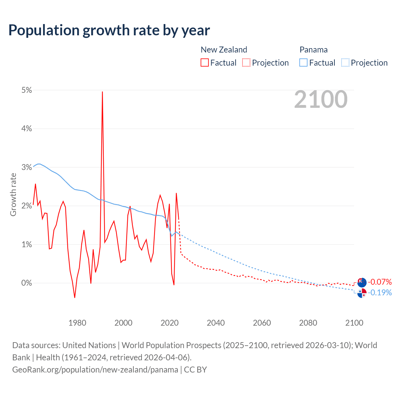 - For the last 10 years, New Zealand has had an average growth rate of +1.6% per year vs +1.52% in Panama.
