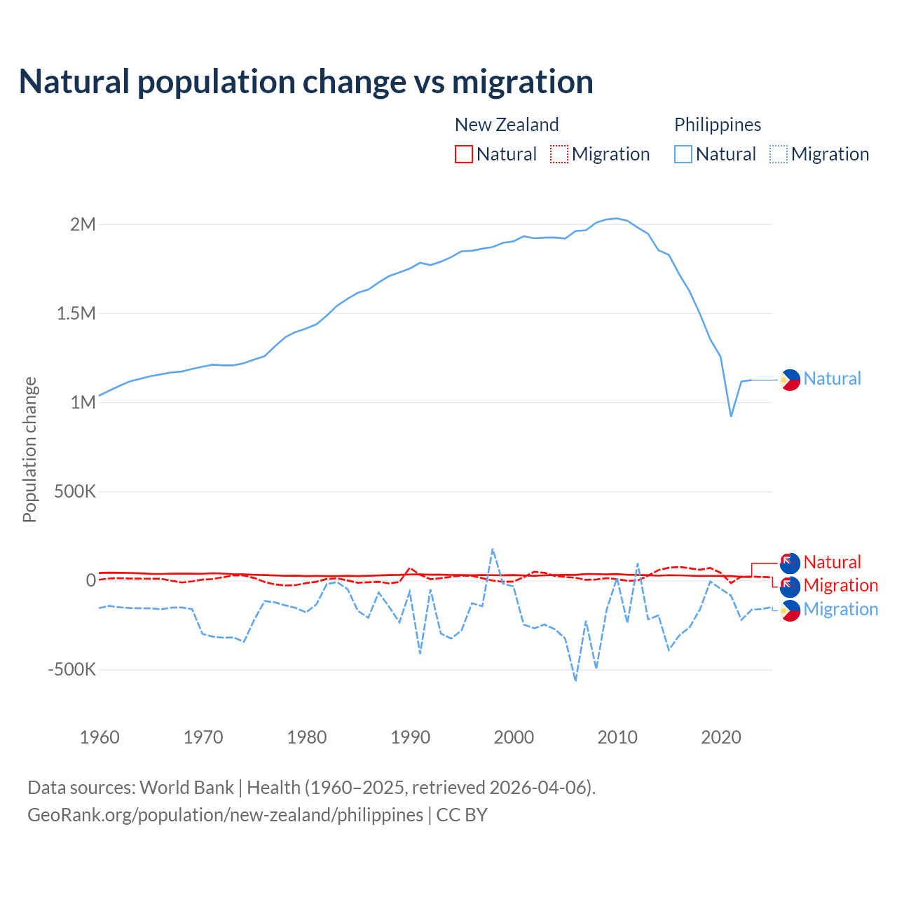 Over the last 10 years, 34.4% of the population change in New Zealand is from natural causes (a gain of 247,767 people) and 65.6% is from migration (a gain of 471,602 people). In the Philippines 88.5% is from natural causes (a gain of 14,279,705 people) and 11.5% is from migration (a loss of 1,848,117 people).