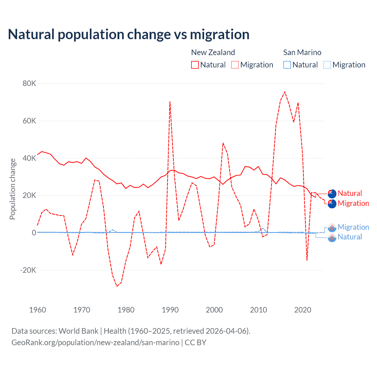 Over the last 10 years, 34.4% of the population change in New Zealand is from natural causes (a gain of 247,767 people) and 65.6% is from migration (a gain of 471,602 people). In San Marino 40.9% is from natural causes (a loss of 358 people) and 59.1% is from migration (a gain of 517 people).