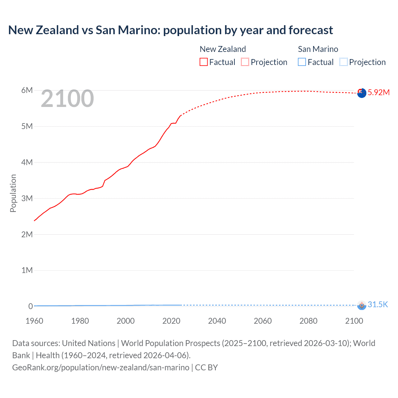 New Zealand vs San Marino: population by year and forecast
