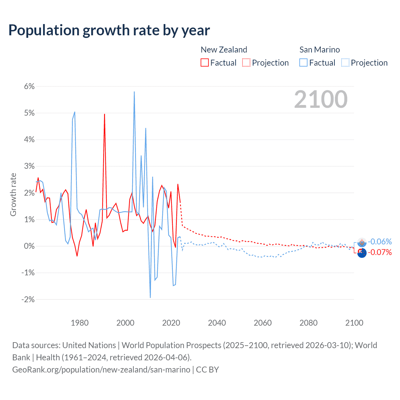 - For the last 10 years, New Zealand has had an average growth rate of +1.6% per year vs +0.26% in San Marino.