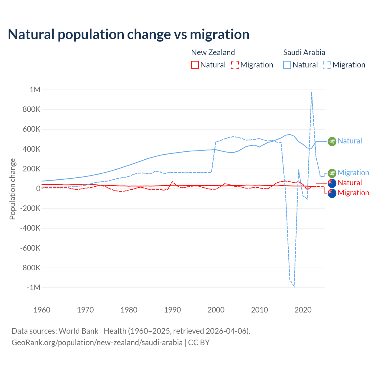 Over the last 10 years, 34.4% of the population change in New Zealand is from natural causes (a gain of 247,767 people) and 65.6% is from migration (a gain of 471,602 people). In Saudi Arabia 93.9% is from natural causes (a gain of 4,829,562 people) and 6.05% is from migration (a gain of 311,209 people).