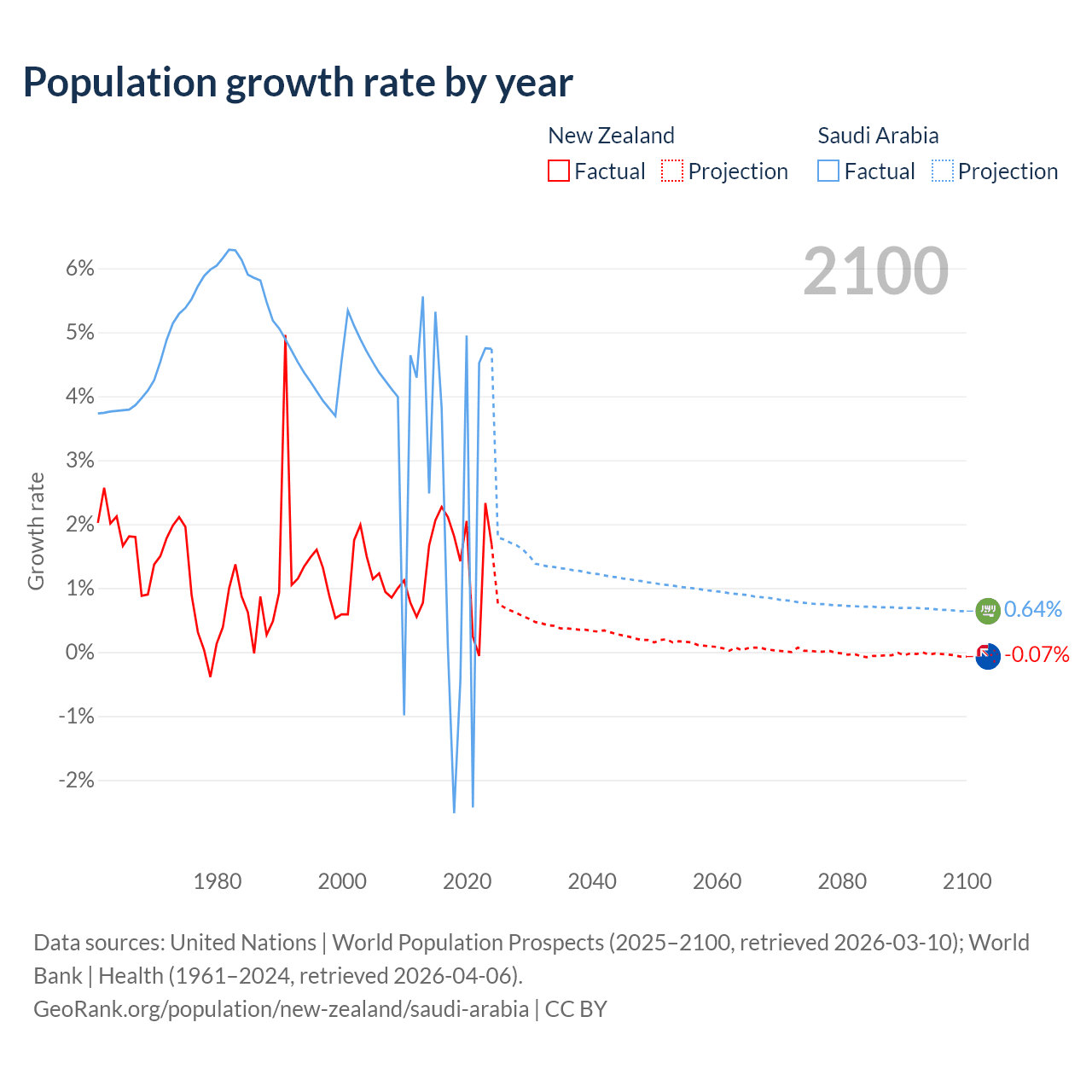 - For the last 10 years, New Zealand has had an average growth rate of +1.6% per year vs +2.3% in Saudi Arabia.