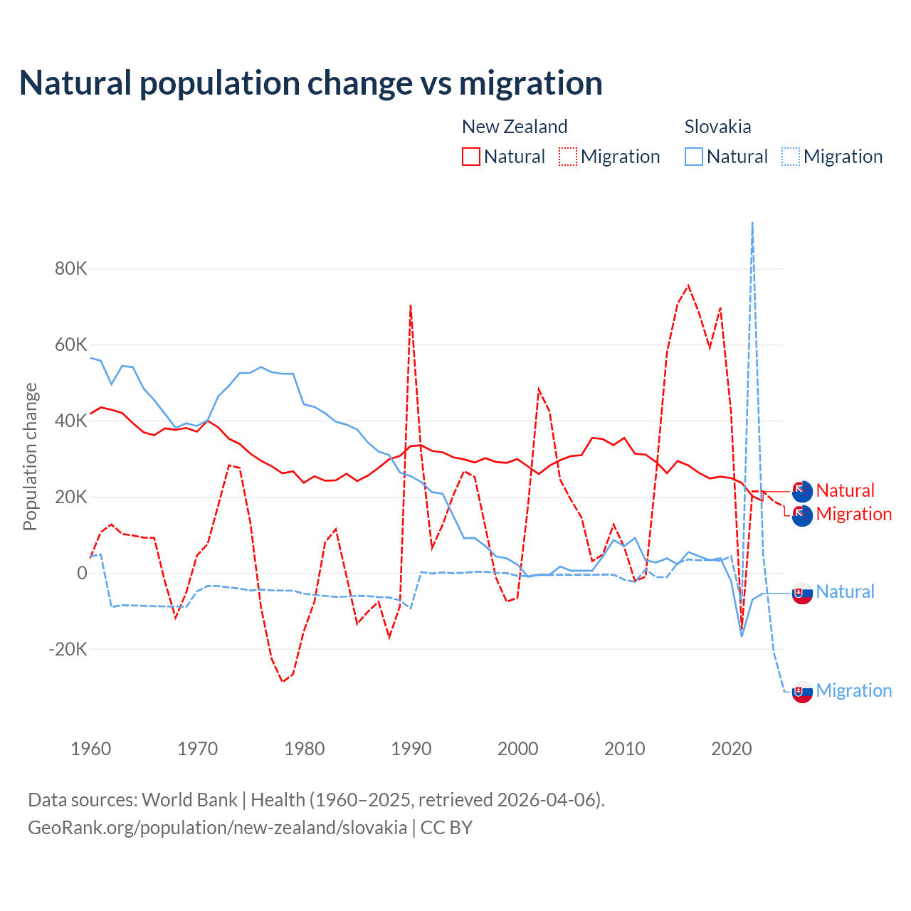 Over the last 10 years, 34.4% of the population change in New Zealand is from natural causes (a gain of 247,767 people) and 65.6% is from migration (a gain of 471,602 people). In Slovakia 7.47% is from natural causes (a loss of 8,728 people) and 92.5% is from migration (a gain of 108,156 people).