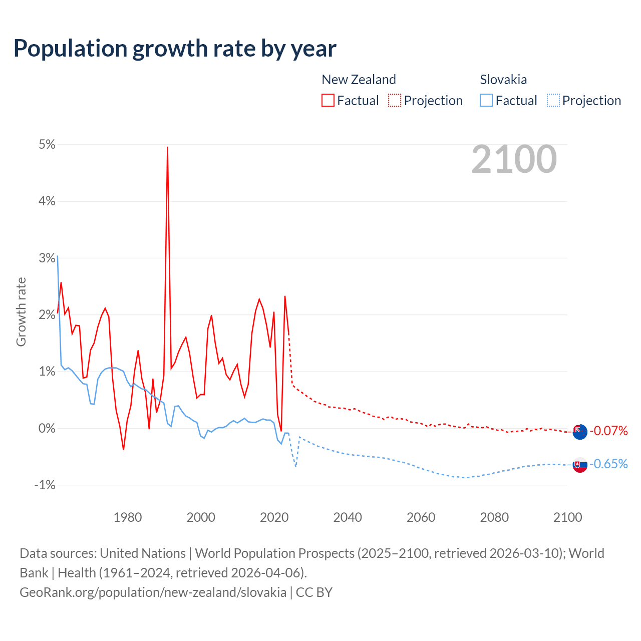 - For the last 10 years, New Zealand has had an average growth rate of +1.6% per year vs +0.01% in Slovakia.