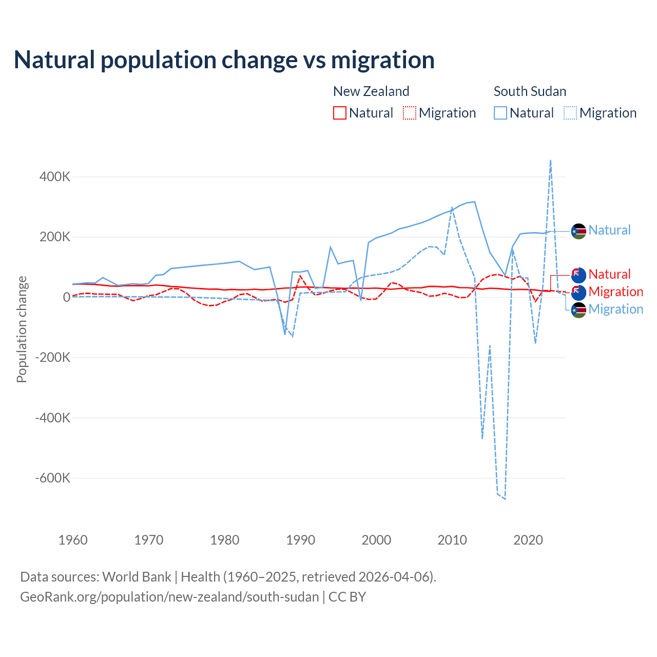 Over the last 10 years, 34.4% of the population change in New Zealand is from natural causes (a gain of 247,767 people) and 65.6% is from migration (a gain of 471,602 people). In South Sudan 57.4% is from natural causes (a gain of 1,792,135 people) and 42.6% is from migration (a loss of 1,329,606 people).