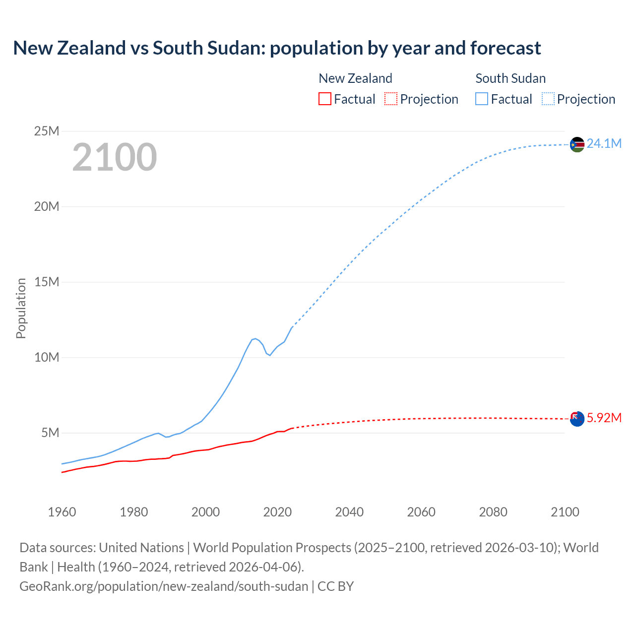 The latest officially reported population of New Zealand was 5,287,500 in 2024 vs 11,943,408 people in South Sudan in 2024. In 2026, based on the adjusted UN estimation, the current New Zealand's population is 5,374,272 people compared to 12,507,858 in South Sudan.