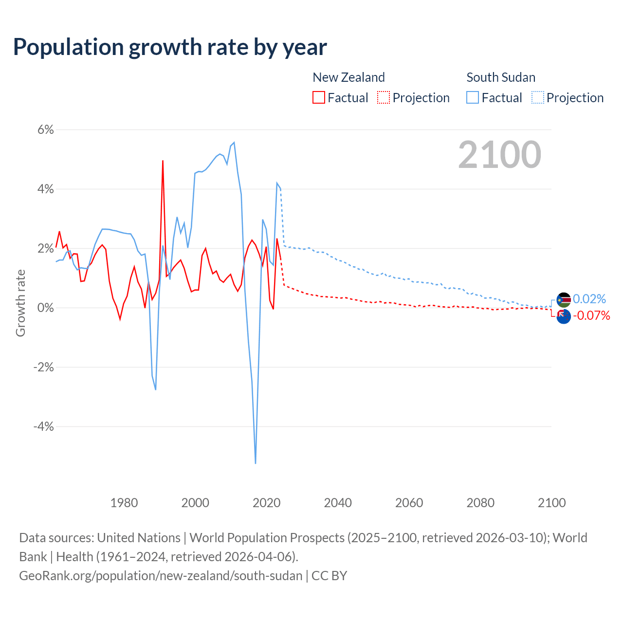 - For the last 10 years, New Zealand has had an average growth rate of +1.6% per year vs +0.65% in South Sudan.