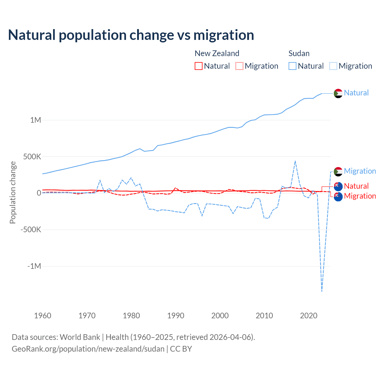 Over the last 10 years, 34.4% of the population change in New Zealand is from natural causes (a gain of 247,767 people) and 65.6% is from migration (a gain of 471,602 people). In Sudan 95.1% is from natural causes (a gain of 12,459,977 people) and 4.88% is from migration (a loss of 639,596 people).