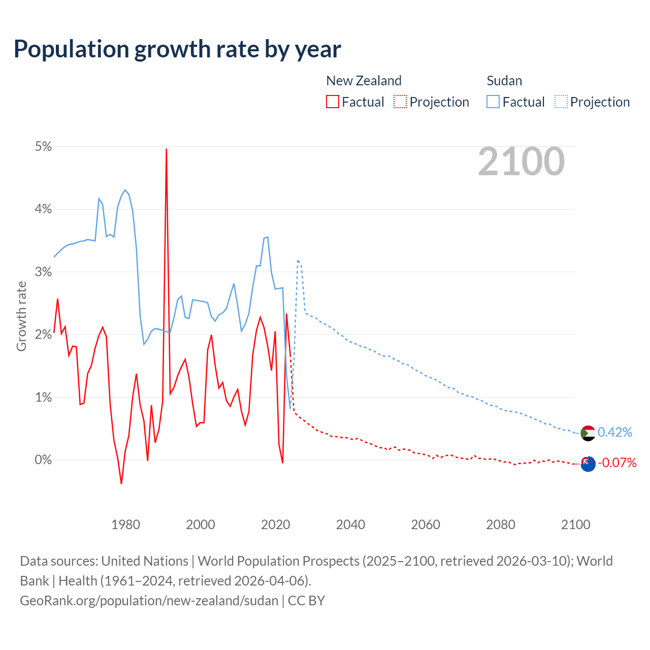 - For the last 10 years, New Zealand has had an average growth rate of +1.6% per year vs +2.67% in Sudan.