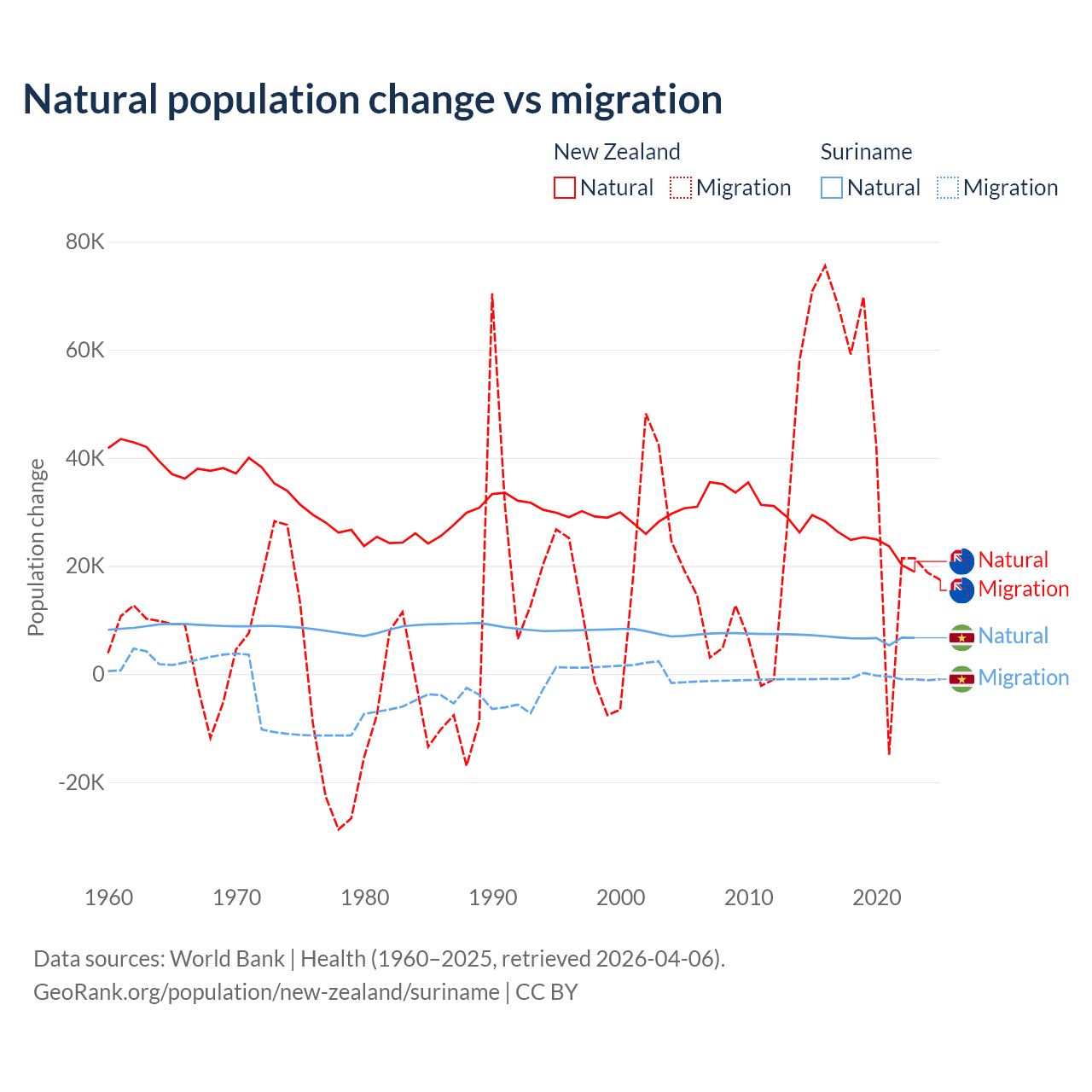 Over the last 10 years, 34.4% of the population change in New Zealand is from natural causes (a gain of 247,767 people) and 65.6% is from migration (a gain of 471,602 people). In Suriname 90.3% is from natural causes (a gain of 66,709 people) and 9.72% is from migration (a loss of 7,185 people).