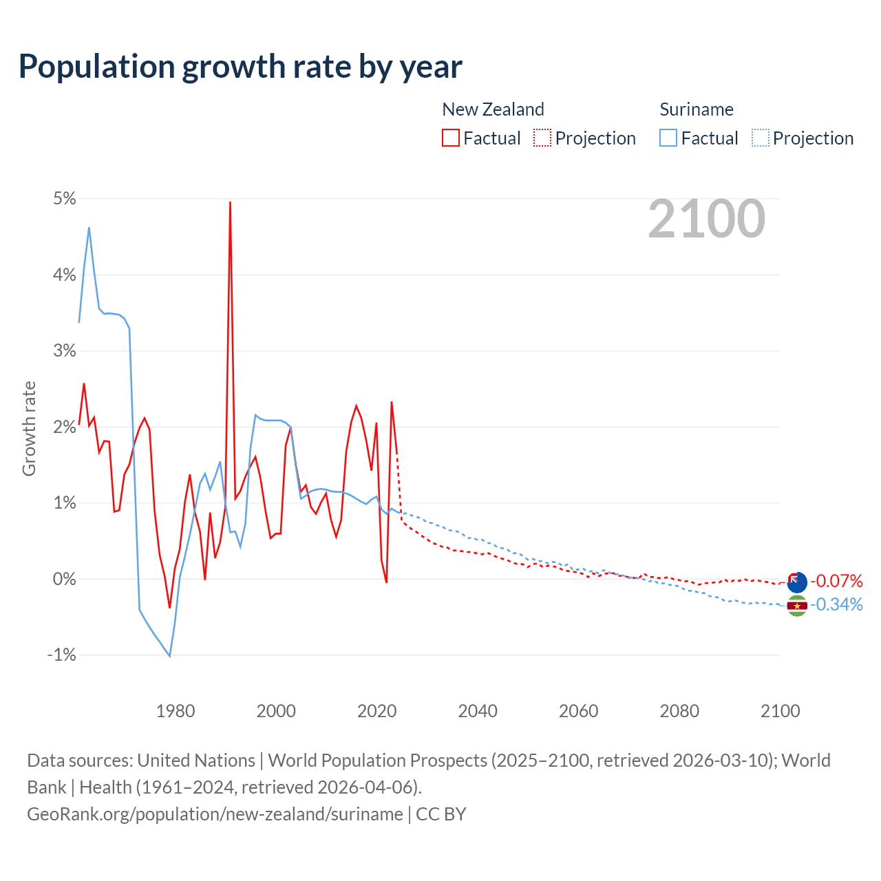 - For the last 10 years, New Zealand has had an average growth rate of +1.6% per year vs +0.99% in Suriname.
