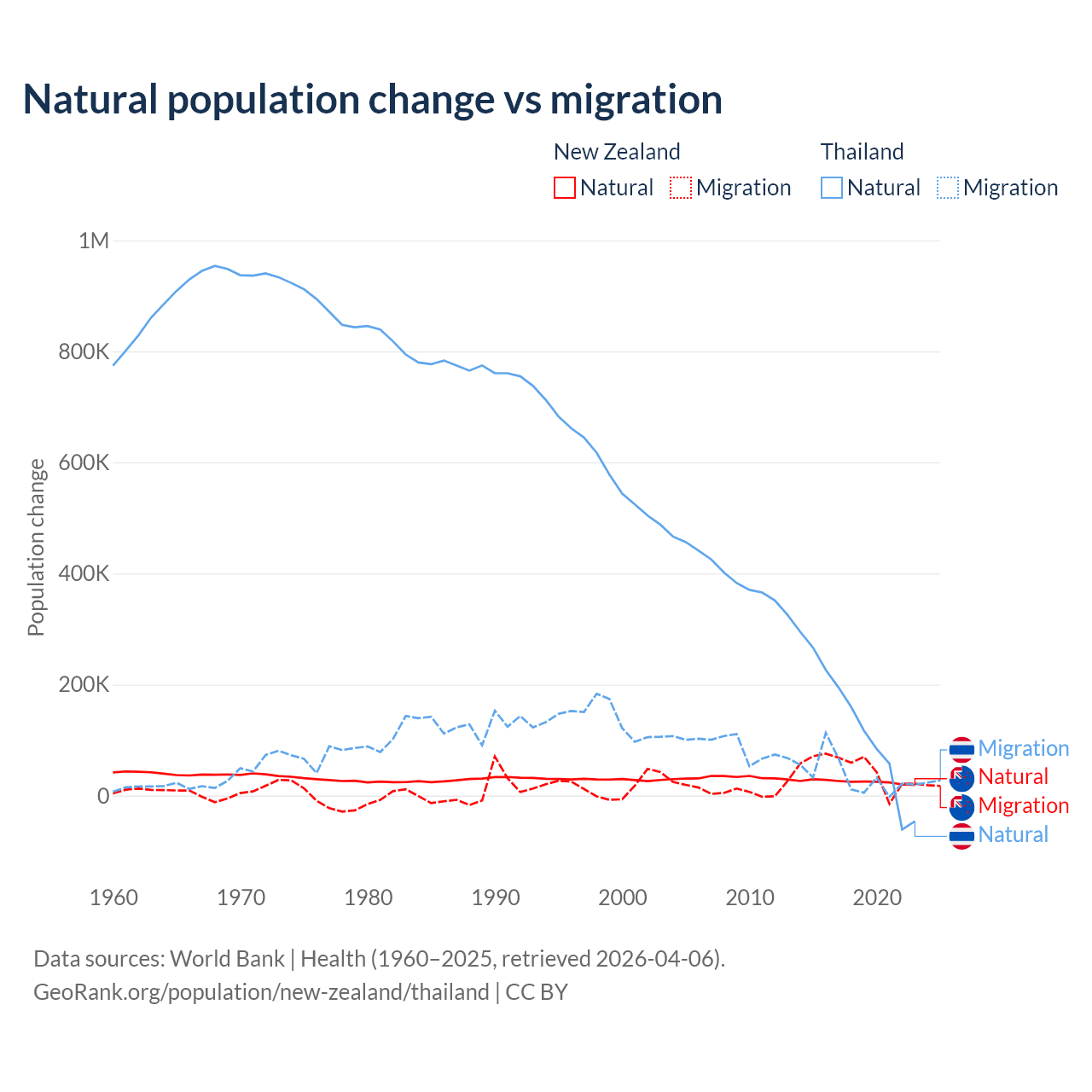 Over the last 10 years, 34.4% of the population change in New Zealand is from natural causes (a gain of 247,767 people) and 65.6% is from migration (a gain of 471,602 people). In Thailand 78.4% is from natural causes (a gain of 1,292,528 people) and 21.6% is from migration (a gain of 355,361 people).