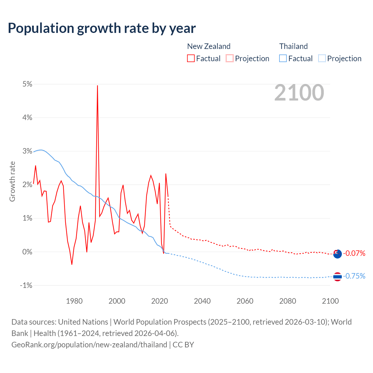 - For the last 10 years, New Zealand has had an average growth rate of +1.6% per year vs +0.23% in Thailand.