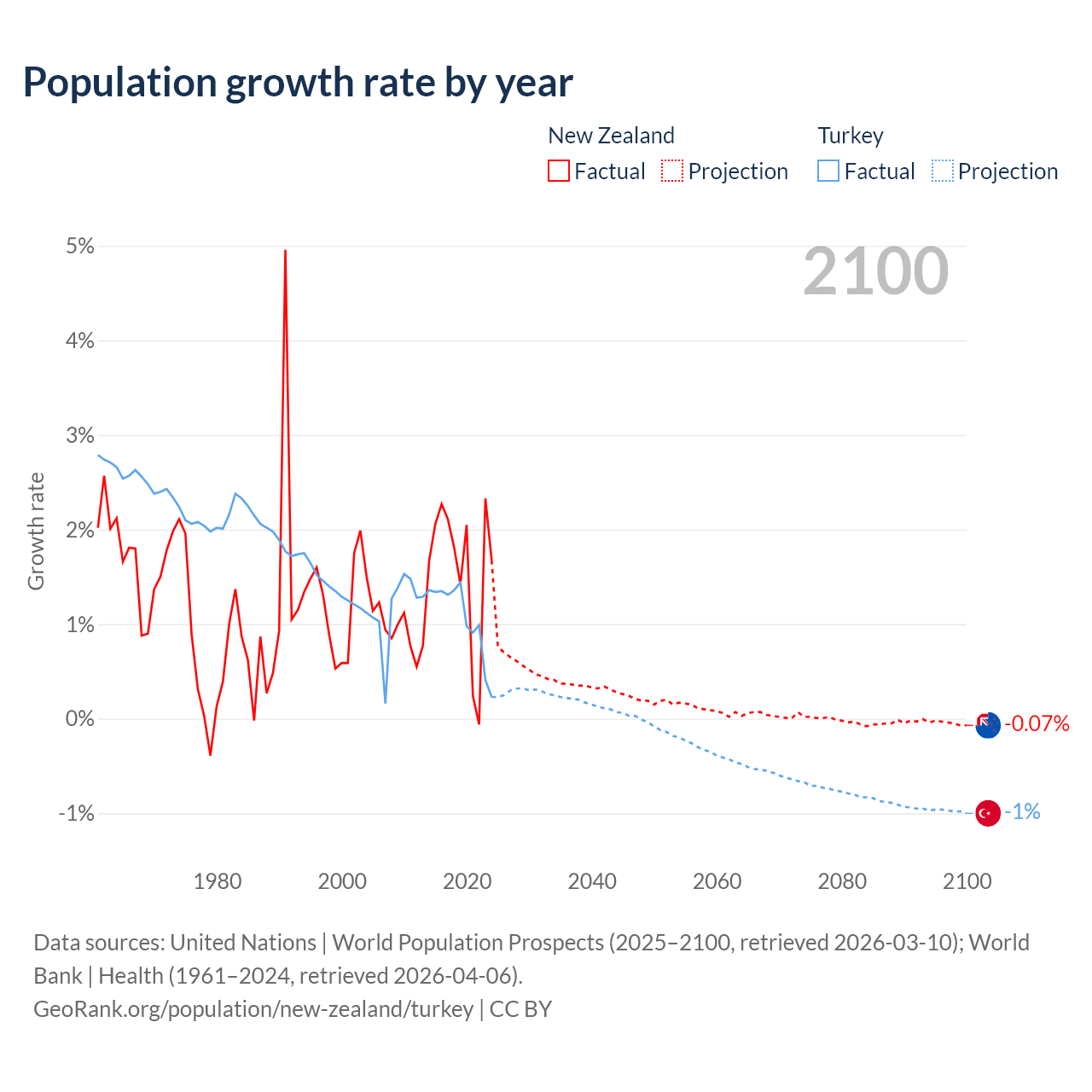 - For the last 10 years, New Zealand has had an average growth rate of +1.6% per year vs +1.06% in Turkey.