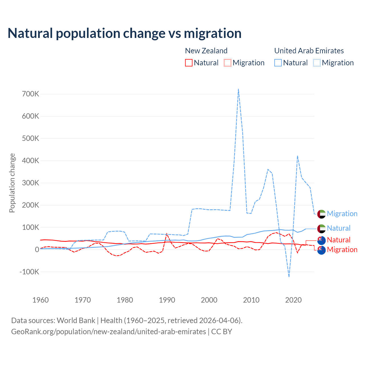 Over the last 10 years, 34.4% of the population change in New Zealand is from natural causes (a gain of 247,767 people) and 65.6% is from migration (a gain of 471,602 people). In the United Arab Emirates 30.5% is from natural causes (a gain of 857,996 people) and 69.5% is from migration (a gain of 1,958,520 people).