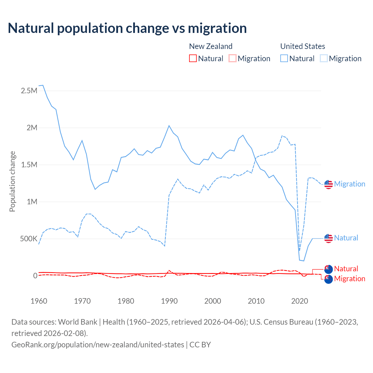 Over the last 10 years, 34.4% of the population change in New Zealand is from natural causes (a gain of 247,767 people) and 65.6% is from migration (a gain of 471,602 people). In the United States 35.8% is from natural causes (a gain of 8,005,866 people) and 64.2% is from migration (a gain of 14,334,286 people).