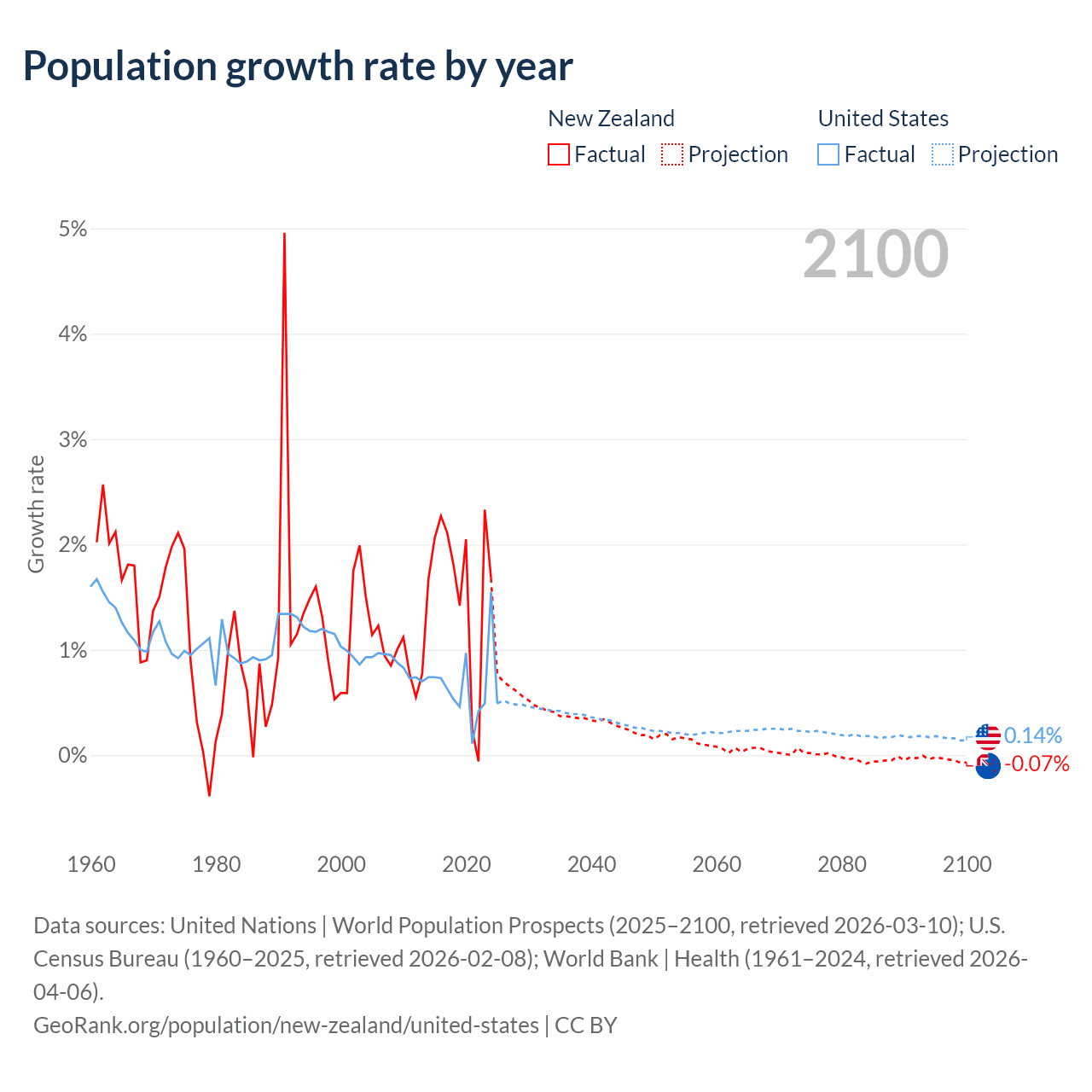 - For the last 10 years, New Zealand has had an average growth rate of +1.6% per year vs +0.65% in the United States.
