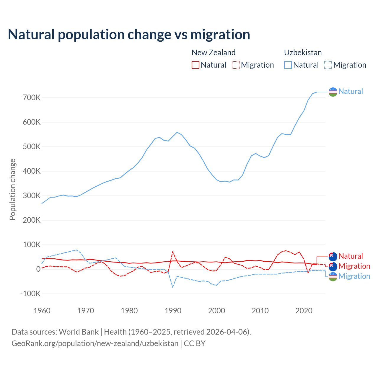 Over the last 10 years, 34.4% of the population change in New Zealand is from natural causes (a gain of 247,767 people) and 65.6% is from migration (a gain of 471,602 people). In Uzbekistan 98.2% is from natural causes (a gain of 6,161,117 people) and 1.84% is from migration (a loss of 115,398 people).