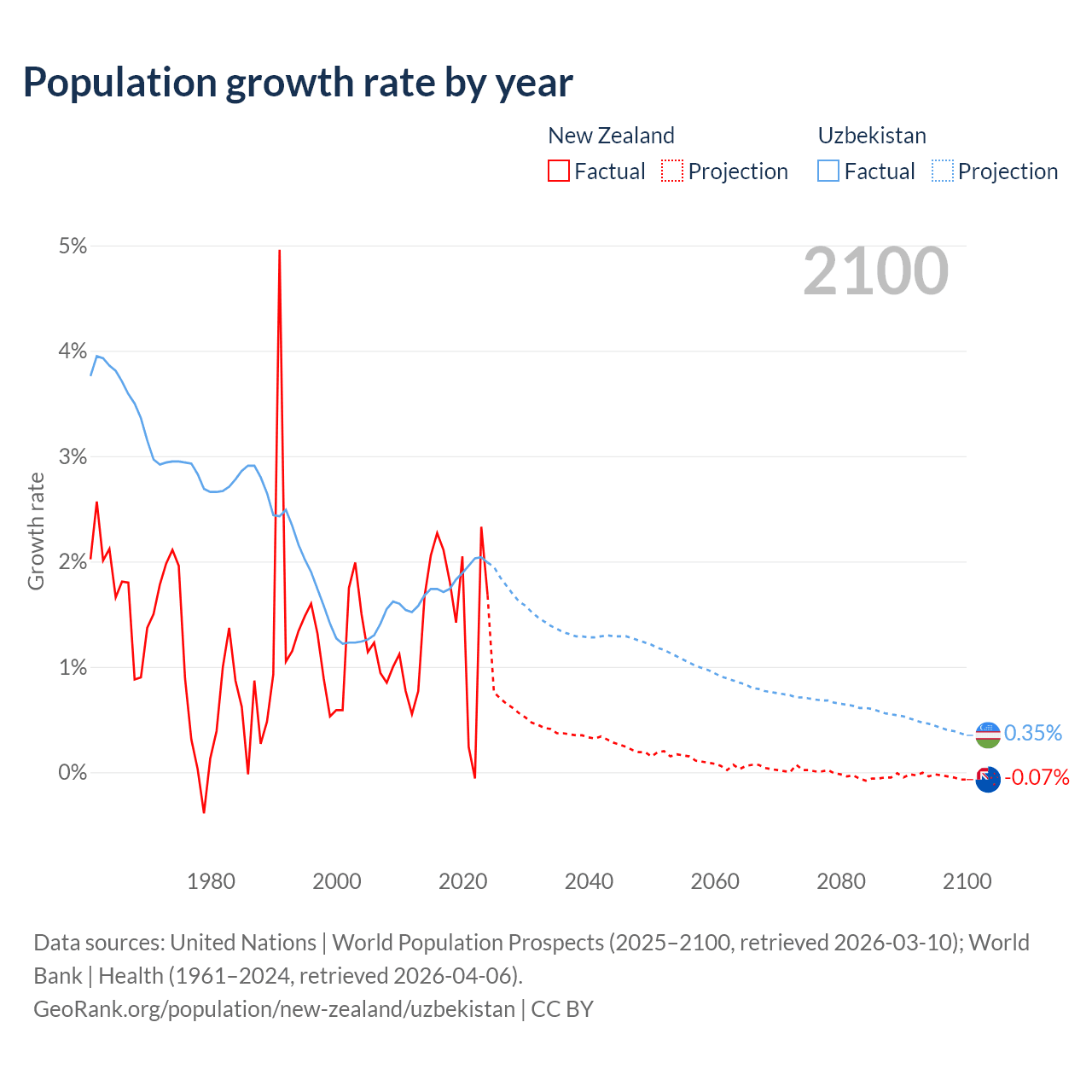 - For the last 10 years, New Zealand has had an average growth rate of +1.6% per year vs +1.85% in Uzbekistan.