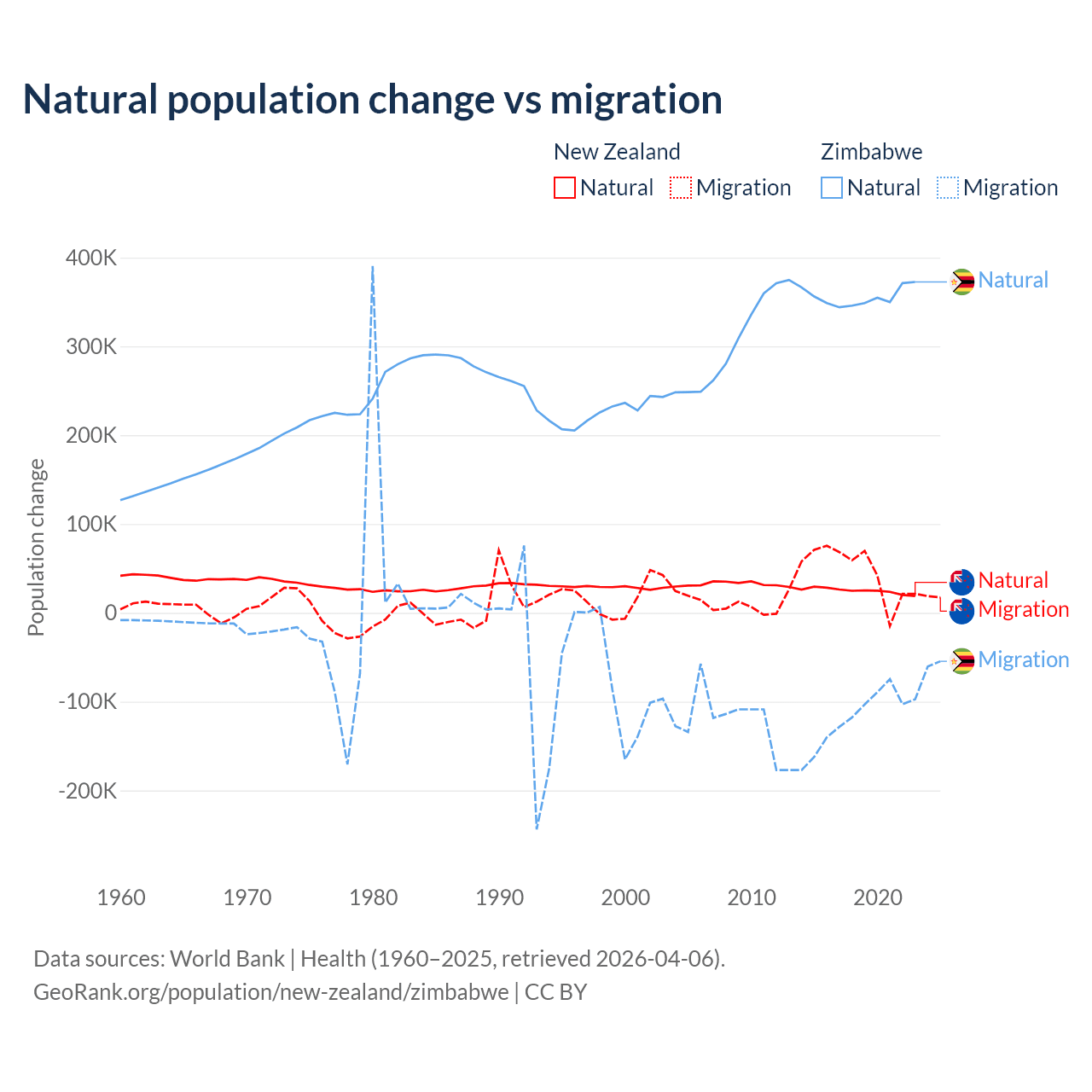 Over the last 10 years, 34.4% of the population change in New Zealand is from natural causes (a gain of 247,767 people) and 65.6% is from migration (a gain of 471,602 people). In Zimbabwe 74.9% is from natural causes (a gain of 3,558,487 people) and 25.1% is from migration (a loss of 1,192,807 people).