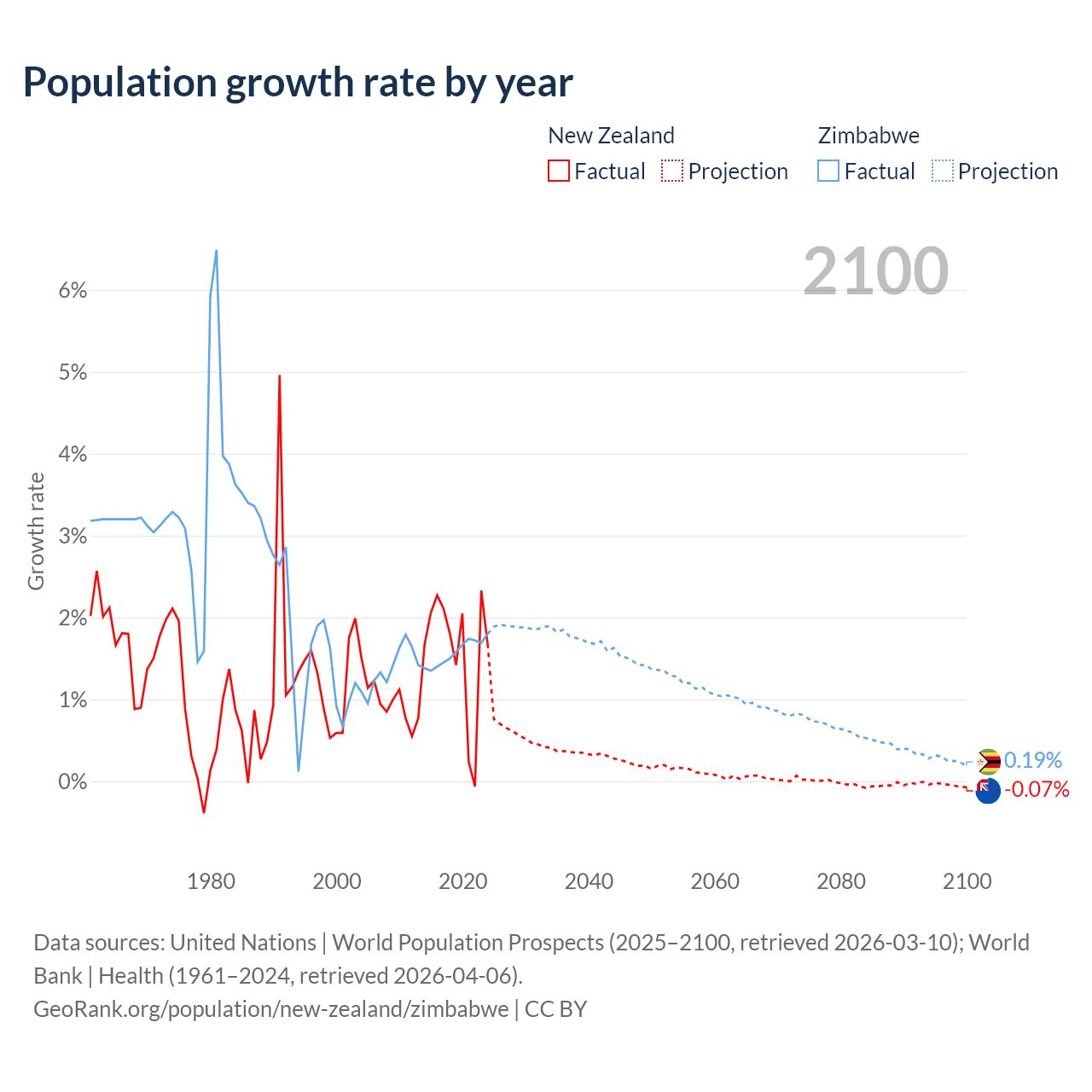 - For the last 10 years, New Zealand has had an average growth rate of +1.6% per year vs +1.57% in Zimbabwe.