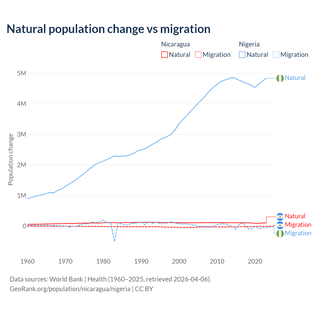 Over the last 10 years, 85.5% of the population change in Nicaragua is from natural causes (a gain of 1,017,084 people) and 14.5% is from migration (a loss of 172,078 people). In Nigeria 99.2% is from natural causes (a gain of 47,163,517 people) and 0.77% is from migration (a loss of 368,103 people).