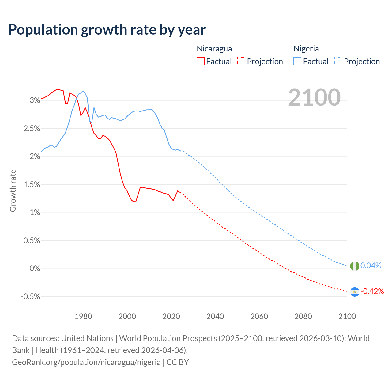 - For the last 10 years, Nicaragua has had an average growth rate of +1.33% per year vs +2.31% in Nigeria.