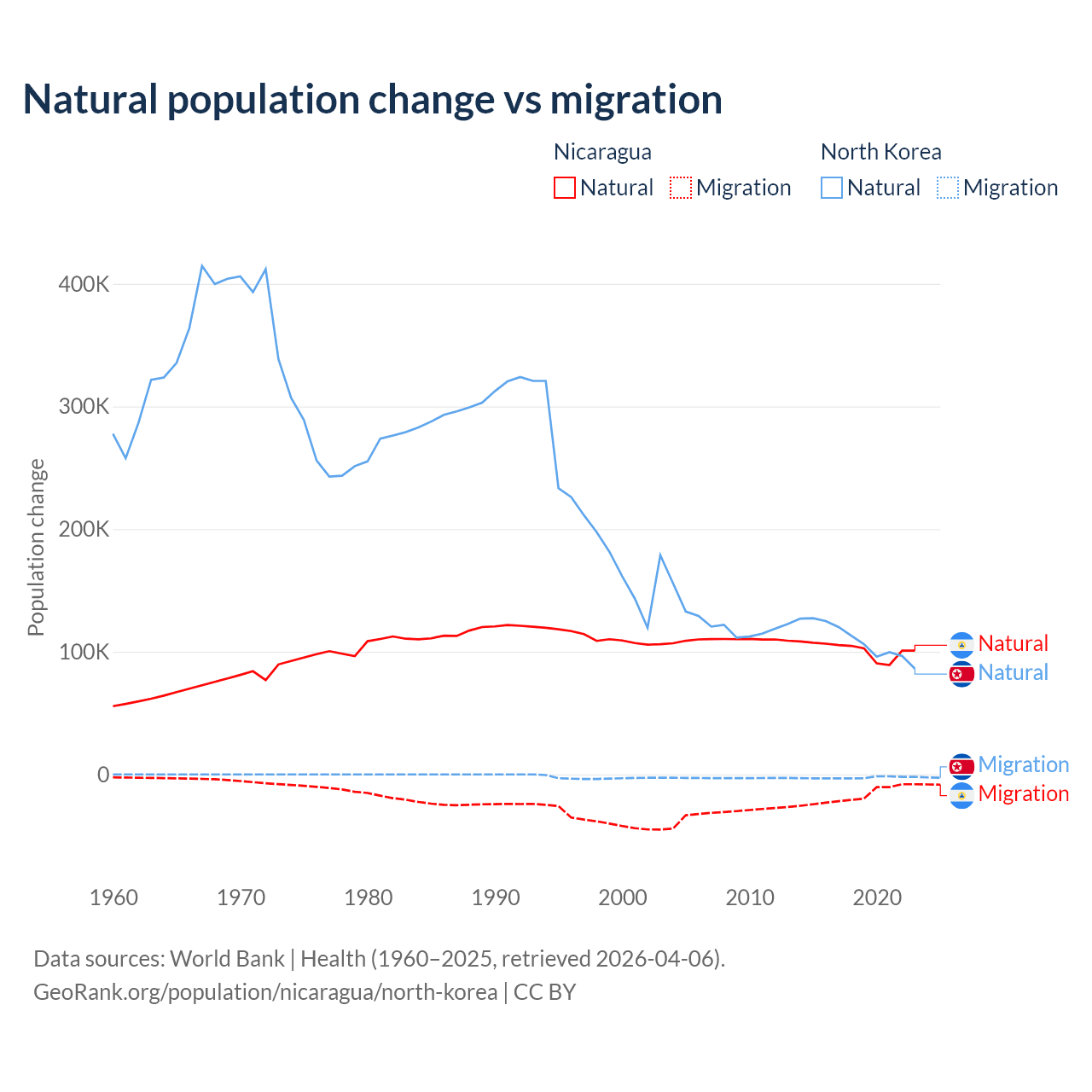 Over the last 10 years, 85.5% of the population change in Nicaragua is from natural causes (a gain of 1,017,084 people) and 14.5% is from migration (a loss of 172,078 people). In North Korea 97.7% is from natural causes (a gain of 1,097,372 people) and 2.33% is from migration (a loss of 26,227 people).