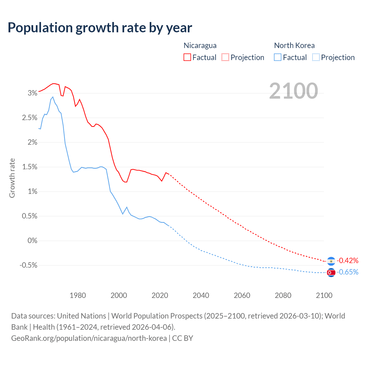 Data sources: World Bank | Health (1960–2024, retrieved 2026-04-06); United Nations | World Population Prospects (1960–2026, retrieved 2026-03-10); U.S. Census Bureau (1960–2025, retrieved 2026-02-08); Central Intelligence Agency (CIA) (2000–2019, retrieved 2026-02-20).