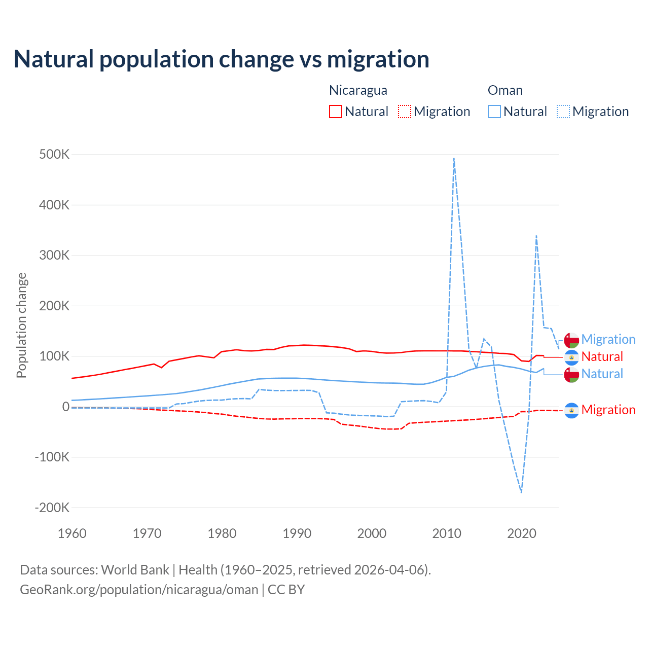 Over the last 10 years, 85.5% of the population change in Nicaragua is from natural causes (a gain of 1,017,084 people) and 14.5% is from migration (a loss of 172,078 people). In Oman 61.6% is from natural causes (a gain of 763,049 people) and 38.4% is from migration (a gain of 475,565 people).