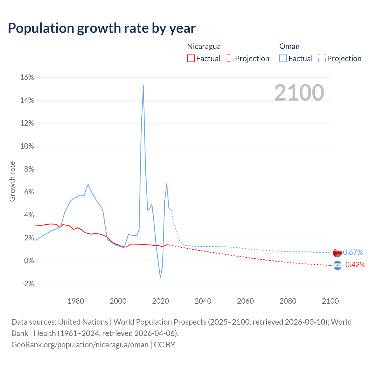 - For the last 10 years, Nicaragua has had an average growth rate of +1.33% per year vs +2.99% in Oman.