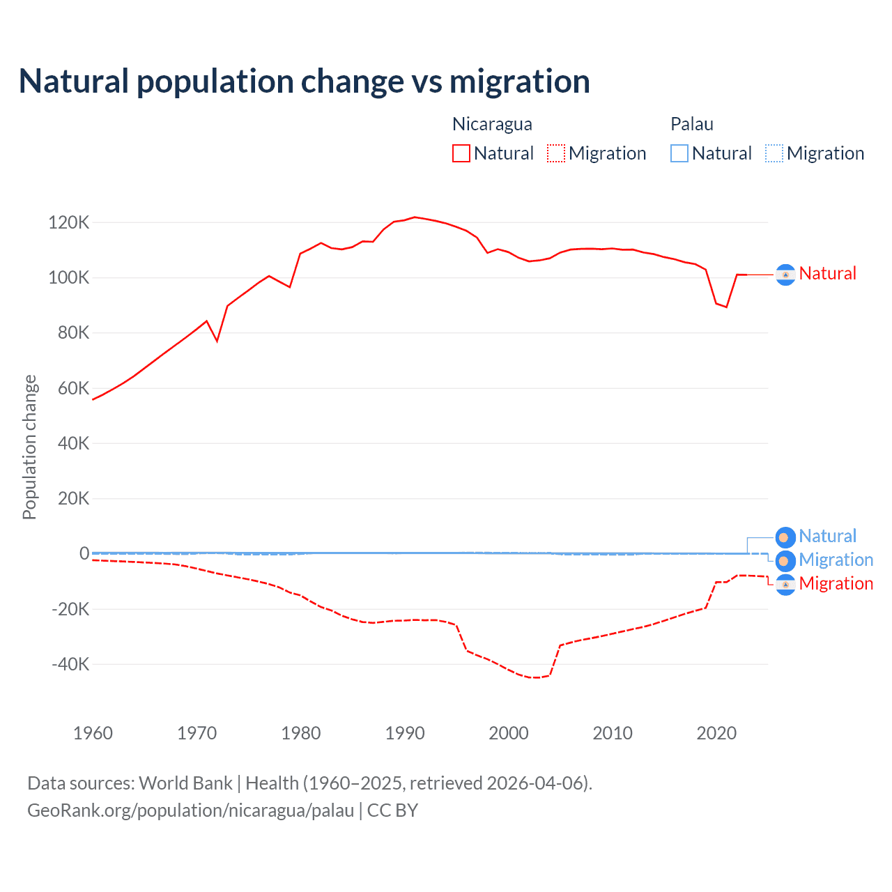 Over the last 10 years, 85.5% of the population change in Nicaragua is from natural causes (a gain of 1,017,084 people) and 14.5% is from migration (a loss of 172,078 people). In Palau 53.8% is from natural causes (a gain of 264 people) and 46.2% is from migration (a loss of 227 people).