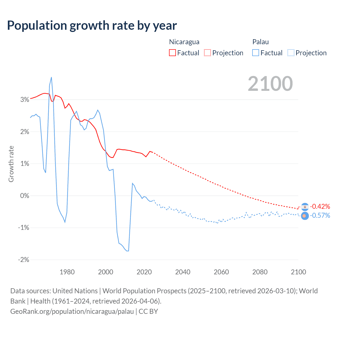 Nicaragua vs Palau: population by year and forecast