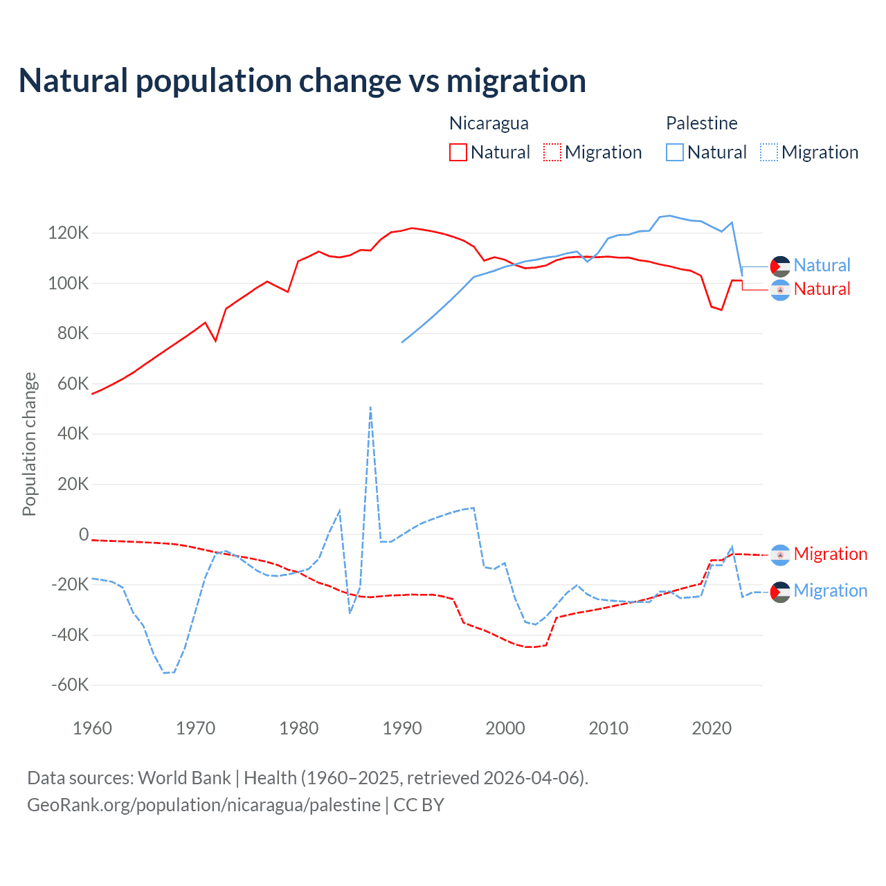 Over the last 10 years, 85.5% of the population change in Nicaragua is from natural causes (a gain of 1,017,084 people) and 14.5% is from migration (a loss of 172,078 people). In Palestine 85.7% is from natural causes (a gain of 1,218,010 people) and 14.3% is from migration (a loss of 202,820 people).