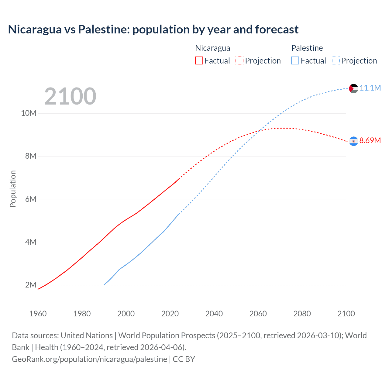 The latest officially reported population of Nicaragua was 6,916,140 in 2024 vs 5,289,152 people in Palestine in 2024. In 2026, based on the adjusted UN estimation, the current Nicaragua's population is 7,124,343 people compared to 5,500,288 in Palestine.