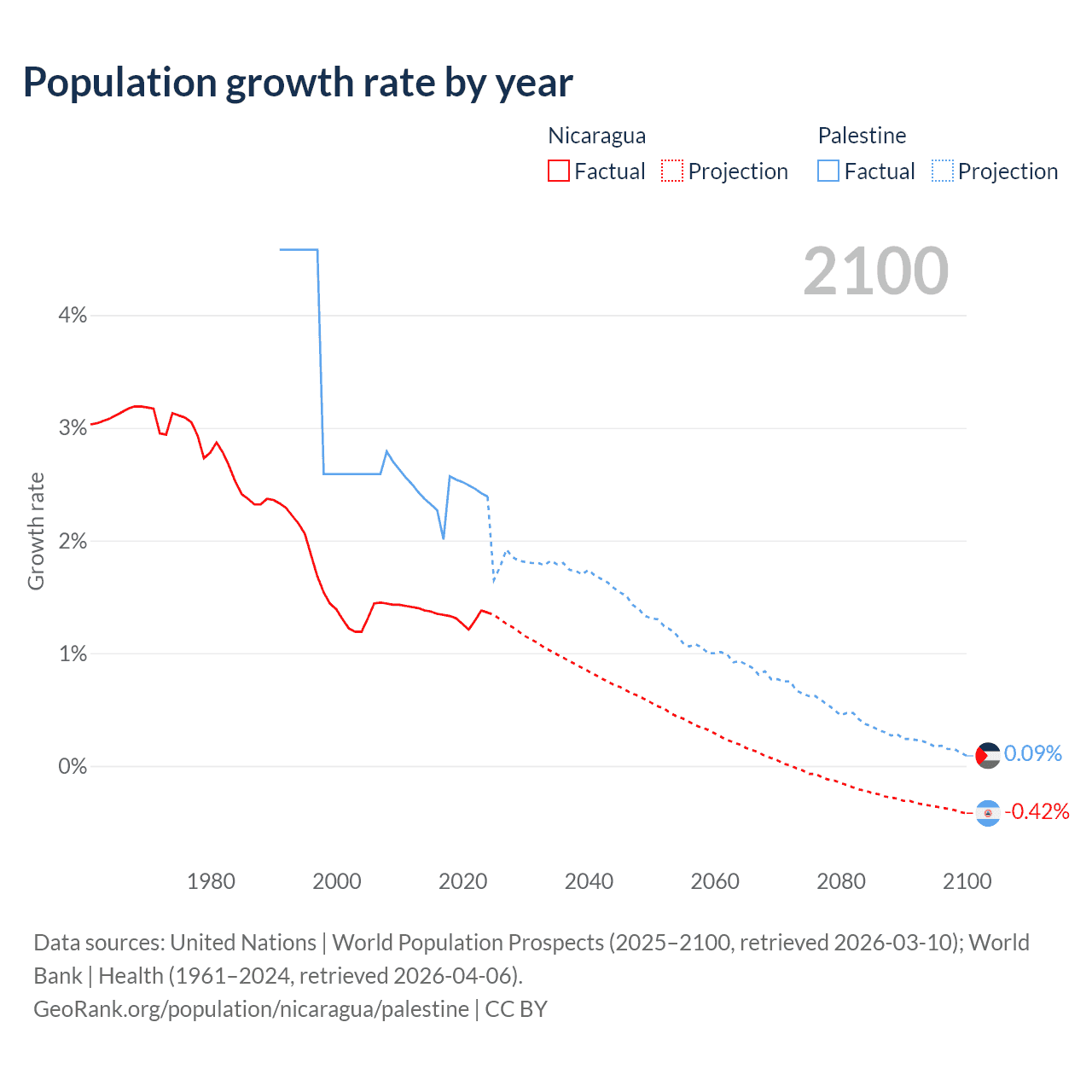 - For the last 10 years, Nicaragua has had an average growth rate of +1.33% per year vs +2.4% in Palestine.