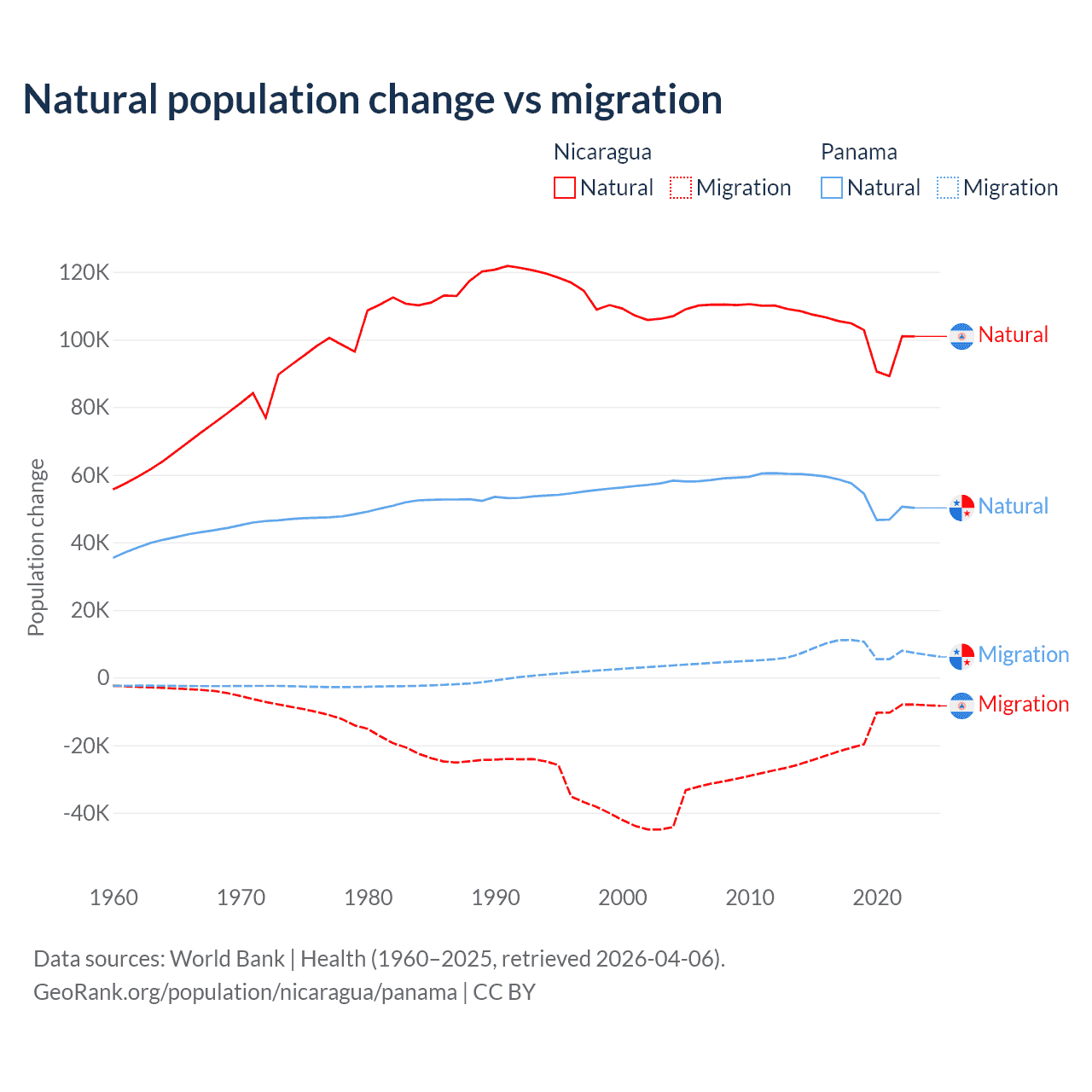 Over the last 10 years, 85.5% of the population change in Nicaragua is from natural causes (a gain of 1,017,084 people) and 14.5% is from migration (a loss of 172,078 people). In Panama 86.5% is from natural causes (a gain of 544,211 people) and 13.5% is from migration (a gain of 84,849 people).