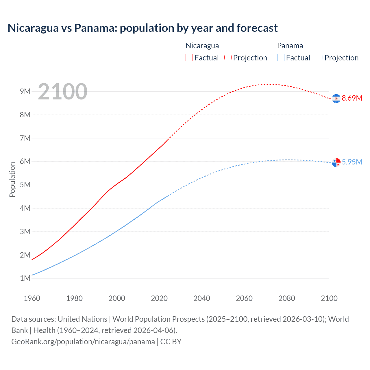 The latest officially reported population of Nicaragua was 6,916,140 in 2024 vs 4,515,577 people in Panama in 2024. In 2026, based on the adjusted UN estimation, the current Nicaragua's population is 7,124,343 people compared to 4,642,198 in Panama.